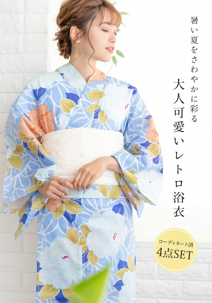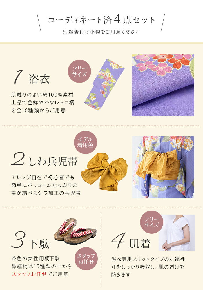 ■ 商 品 情 報 モデル着用のコーディネート通りの[浴衣]+[帯]+[下駄]+[肌着]の4点セットをお届けします! 今年こそ浴衣を着たいけれどどれを選べばいいか迷ってしまって結局着ないまま…そんなお客様には当店の浴衣は特におすすめ! こちらの浴衣には、モデル着用画像のしわ兵児帯がつきます! 着物屋さんの失敗しない浴衣コーディネートでこの夏を満喫してください♪